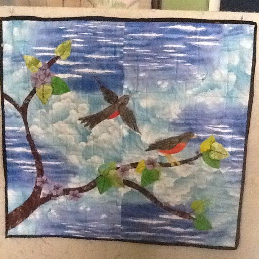 4 shapes, heart shaped leaves, triangle shaped bird beaks, squares & rectangles in the quilting. Techniques used therein include machine appliqué, fusing, colored pencils, thread sketching, glitter and machine quilting. It measures 29" by 27". I'm entering it in a traveling show of the Kentucky Heritage Quilt Society's Presidents Challenge 2013. I hope it gets in. It will be the first time I've entered a piece in that venue.